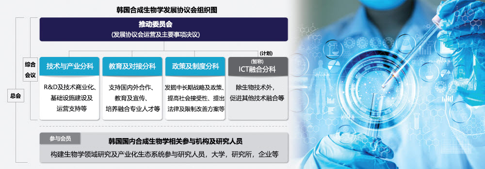 发展协议会是为了民官共同合作,克服通过合成生物学被指为生物研究顽疾问题的速度和规模、不确定性局限而准备的。计划建立政策咨询和国内外研究及促进合作、构建产学研融合体系等合成生物学培养基础。韩国科技部将作为发展协议会的研发及政策、制度等咨询机构,由领域专家共55人组成。