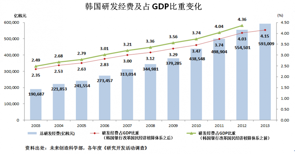 ![]() 韩国研发经费投入占GDP比重连续2年世界第一。 根据11月23日韩国未来创造科学部发布的《2013年研发活动调查》结果,2013年韩国R&D经费投入达593,009亿韩元(约合541亿美元),比2012年增加6.9%,居世界第6位。1~5位分别是美国4,534亿美元,日本1,991亿美元,中国1,631亿美元,德国1020亿美元,法国589亿美元。 但是韩国研发经费投入占GDP比重达4.15%,蝉联世界第一位(2012年4.02%,世界第一)。其余9国分别是以色列(3.93%)、芬兰(3.55%)、瑞典(3.41%)、日本(3.35%)、台湾(3.06%)、德国和丹麦(2.98%)、瑞士(2.87%)、澳大利亚(2.86%)。 按资金来源看,民间资金以448,792亿韩元占75.7%,政府和公共部门资金142,417亿韩元占24%, 外国资金1,800亿韩元占0.3%。 按执行部门看,企业是主体,企业投入R&D经费465,599亿韩元,占总量的78.2%。公共研究机构投入72,607亿韩元,大学投入54,803亿韩元。 按活动类型看,实验发展领域R&D经费占比最大,为373,193亿韩元。应用研究占113,159亿韩元,基础研究为106,658亿韩元。 R&D人员数量为410,333人,其中全时当量(FTE)321,842人,居世界第6位。 图: 韩国研发经费及占 GDP比重变化 |