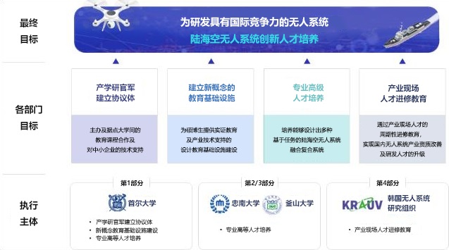 作为地区据点大学的忠南大学和釜山大学计划与首尔大学一起开发无人系统课程,并代表中部地区和南部地区设置和运营无人系统硕博课程。