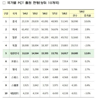 ![]() 韩国企业专利、设计等知识产权国际申请增长率在申请PCT数(专利国际申请)前十位的国家中位列第一,海牙申请(设计国际申请)设计数居世界第二。 据韩国专利厅9日公布的2019年世界知识产权组织(WIPO)成果资料显示,三星电子和LG电子等韩国企业2019年申请PCT量为世界第五,总计1万9085件,申请PCT增长率为12.8%,增长率位列第一。其他国家增长率分别为,中国10.6%、美国2.8%、日本5.9%、德国-2.0%、韩国12.8%、法国0.2%、英国2.7%、瑞士0.7%、瑞典0.4%、荷兰-3.0%。 2019年在海牙申请的设计数中,韩国也呈现增长趋势。韩国企业在海牙申请的设计数从2018年的1545件(2018年世界第三位)增加到2019年的2736件,增幅77.1%,超过瑞士位居世界第二。 韩国专利厅去年制定了国家层面的海外知识产权确保战略,并对海外专利申请费给予了资金支持。 韩国专利厅厅长表示,自去年通过政府和民间的共同努力,在确保海外知识产权方面取得了积极成效。今后将制定相关扶持计划,使企业在海外有效地保护和利用知识产权,在激烈的国际竞争中取得胜利。 各国申请PCT现状 序号 国家 2014年 2015年 2016年 2017年 2018年 2019年 数量 增长率 1 中国 25,539 29,839 43,091 48,905 53,345 58,990 10.6% 2 美国 61,492 57,123 56,591 56,676 56,142 57,840 2.8% 3 日本 42,459 44,053 45,209 48,205 49,702 52,660 5.9% 4 德国 18,008 18,004 18,307 18,951 19,883 19,353 -2.0% 5 韩国 13,119 14,564 15,555 15,751 16,917 19,085 12.8% 6 法国 8,319 8,421 8,210 8,014 7,914 7,934 0.2% 7 英国 5,280 5,290 5,504 5,568 5,641 5,786 2.7% 8 瑞士 4,115 4,265 4,369 4,488 4,568 4,610 0.7% 9 瑞典 3,925 3,842 3,719 3,975 4,162 4,185 0.4% 10 荷兰 4,218 4,334 4,675 4,430 4,138 4,011 -3.0% 信息来源: https://news.naver.com/main/read.nhn?mode=LS2D&mid=shm&sid1=105&sid2=228&oid=421&aid=0004574789 发布机构: 韩国网络媒体 发布时间:2020.04.09 信息来源 : https://news.naver.com/main/read.nhn?mode=LS2D&mid=shm&sid1=105&sid2=228&oid=421&aid=0004574789 |