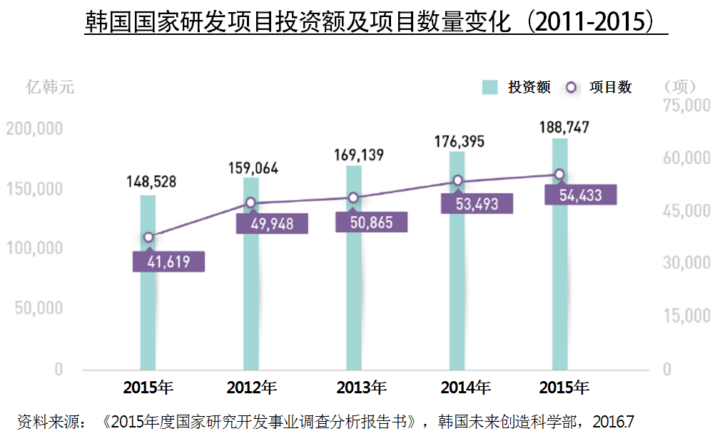 | 2015年韩国国家研发项目投资额及项目数量变化 | ||