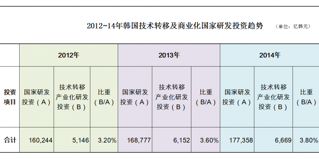 ![]() 韩国技术转移及商业化国家研发投资 表1:2012~14年韩国技术转移及商业化国家研发投资趋势 图1:各研发阶段技术转移及商业化国家投资额(2013) 图2:技术转移及商业化国家各研发主体投资额(2013) 资料来源: Lee Gil Woo等,《促进国家研发项目技术转移、产业化方案的研究》, 韩国科学技术企划评价院, 2015.02 |