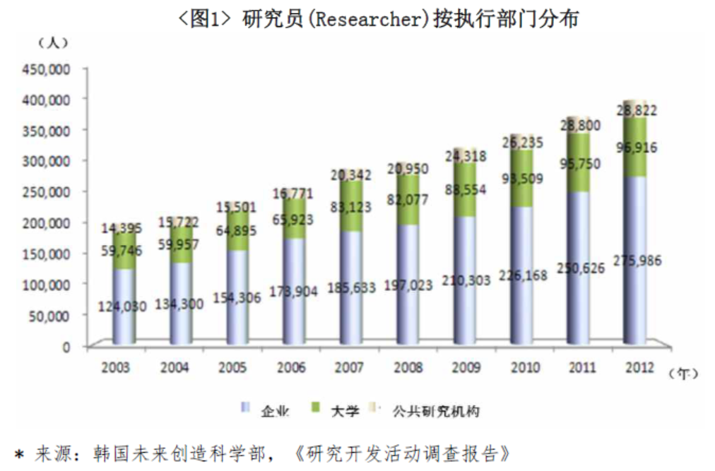 ![]() 全文请见附件。 I. 韩国研发人员概况 1. 研发人员总量 <表1> 韩国R&D人员总量(2008~12年) <表2> 韩国研究员(Researcher)数量(FTE标准) 2. 研发人员平均数量 <表3> 每万名人口中研究员(Researcher)数量 II. 韩国R&D人员分布 1. 按执行部门分布 <图1> 研究员(Researcher)按执行部门分布 <图2> 主要国家的研究员按执行部门分布比重比较 2. 按性别分布 <图3> 研究员(Researcher)性别分布 <图4> R&D人员性别分布 3. 研究员学历分布 <图5> 研究员(Researcher)学历分布 <图6> 研究员(Researcher)按执行机构、性别分布(2012) 4. 研究员按产业分布 <图7> 研究员(Researcher)按产业分布 III. 人才培养 <表4> 韩国理工类在校生 <表5> 韩国理工类毕业生 |