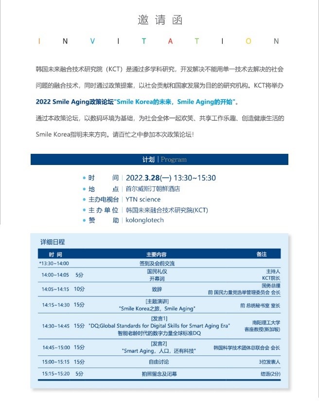 最近随着老龄化的急速发展,以老人为对象的技术“老龄技术“产业日益发展。特别是通过科学技术,包括老年层在内的所有人员一起微笑工作,寻找创造健康生活的解决方法,所谓的“Smile Aging”备受瞩目。为了打造更加幸福的老龄化社会,韩国未来融合技术研究院准备了第一届Smile Aging政策论坛。