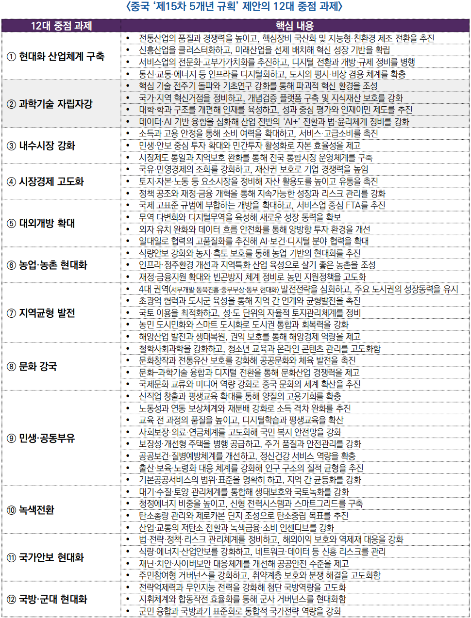 (12대 중점 과제) 현대화 산업체계 구축, 과학기술 자립자강, 내수시장 강화, 시장경제 고도화, 대외개방 확대, 농업·농촌 현대화, 지역균형 발전 등