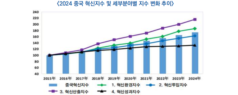 □ 국가통계국의 ‘중국 혁신 지수 연구’ 보고에 따르면, ′24년 중국의 혁신 지수는 174.2 (′15년을 100으로 기준) 으로, 전년 대비 5.3% 증가(25.10.29)