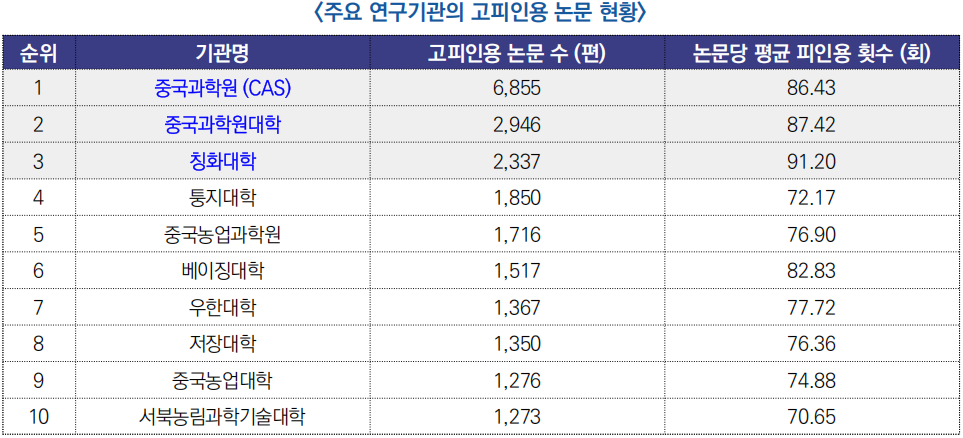 - 최근 10년간(2015~2024년) 중국 학술지는 약 1,200만 편의 논문을 게재했으며, 총 피인용 횟수 7,100만 회, 논문당 평균 6회, 고피인용 논문은 15.8만 편에 달함