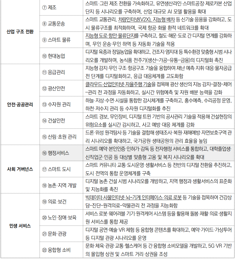 ○ (내용) 이번 ‘시행 의견’은 총 22개 적용 분야를 제시하였으며, 신흥산업(디지털경제·AI·바이오·신재생에너지 등)뿐 아니라 제조·교통·농업·물관리·공공서비스 등 기존 산업의 업그레이드형 시나리오까지 포함