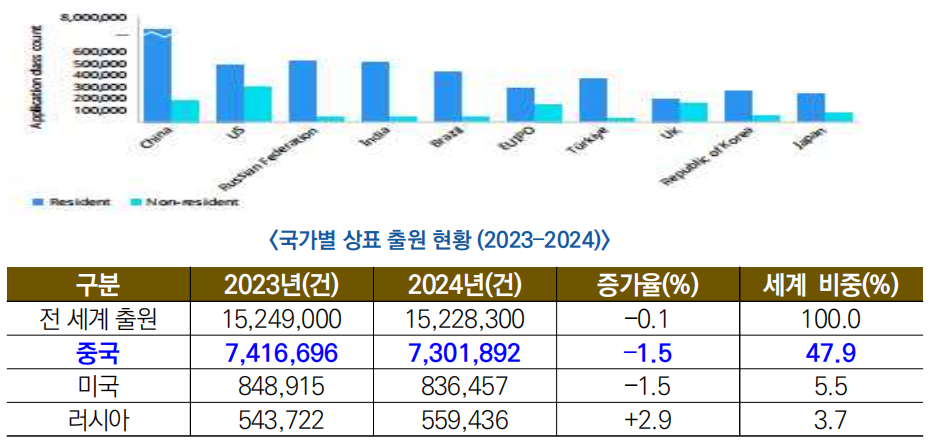 - 2024년 상표 출원 건수는 중국이 약 730만 건으로 세계에서 가장 많았으며, 뒤이어 미국(836,457건), 러시아(559,436건), 인도(532,900건), 브라질( 436,291건)순으로 나타났음