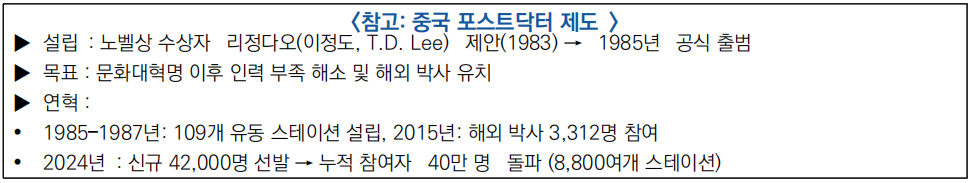 * 포스트닥터(博士后, Post-Doctor): 박사 학위 취득 후 학제간·혁신적 연구를 수행하는 고급 연구 인력