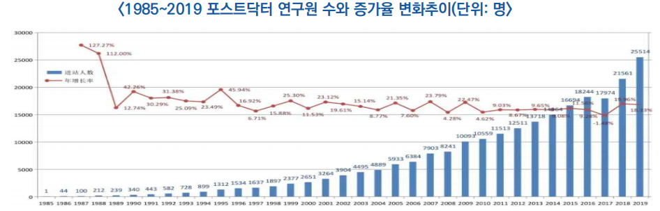 * 현재 재직 포스트닥터 연구원은 13.5만 명으로, 이 중 공학·이학·농학·의학 분야 인원이 11.8만 명(87.5%)을 차지