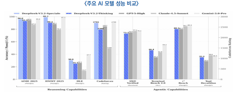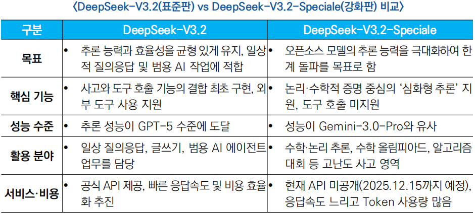- DeepSeek-V3.2는 일상적 활용에 최적화된 모델로, 공개 추론 테스트에서 GPT-5 수준에 도달했으며 구글의 제미나이 3.0 Pro보다 약간 낮은 성능을 보유