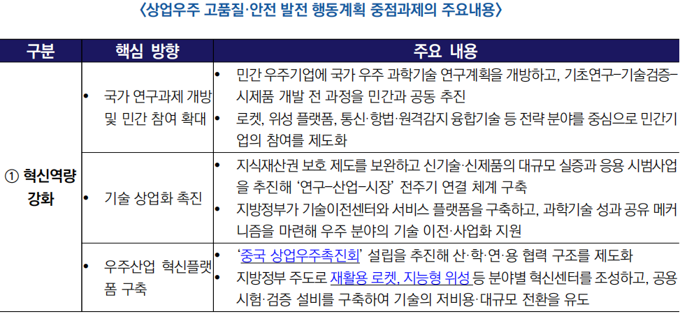 - (투자 구조 전환) ‘장기 자본’ 육성과 국가 상업우주 발전기금 설립을 명시해, 단기 수익 중심의 투자 구조에서 벗어나 핵심 기술력·사업 지속가능성을 중요시하는 장기투자 생태계로 전환