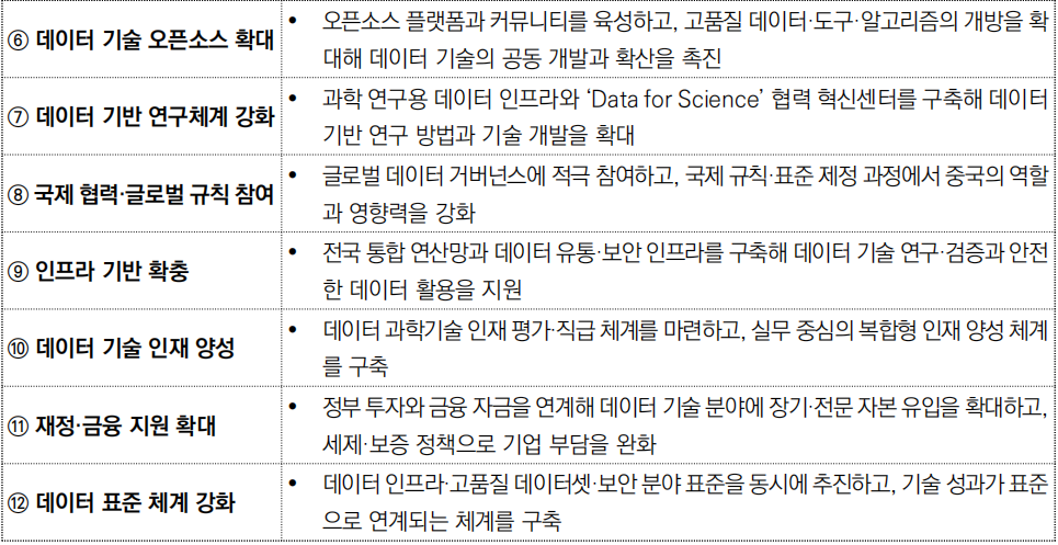 ○ (내용) 데이터 기술의 연구개발부터 검증·응용·표준·산업화까지 전 주기를 포괄하는 12대 조치를 통해 국가 차원의 데이터 과학기술 혁신 체계를 구축