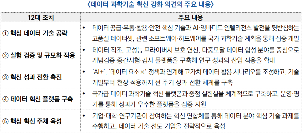 * 의견은 데이터 공급–유통–활용–안전 전 주기를 포괄하는 기술·공학 혁신을 ‘데이터 과학기술’로 정의하고, 데이터를 더 정확히 수집하고, 안전하게 유통하며, 지능적으로 활용하고, 기반 인프라를 안정화하는 기술 체계 구축을 의미함