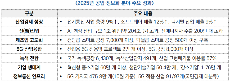 (2025년 성과) 공업·정보화 분야는 AI 산업 1조 위안(약 204조 원) 돌파, 5G 기지국 475.8만 개 구축, 스마트공장 7,000개 이상 확산을 달성