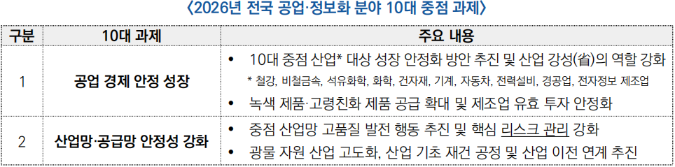 (2026년 과제) 이번 회의에서 공업·정보화 정책은 산업 안정 성장, 기술혁신, 정보화·공업화 융합, 신흥·미래 산업 육성, 산업 거버넌스 강화 등 10대 과제 제시