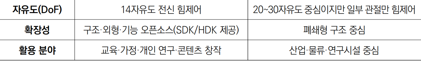 - (개방성) 로봇의 외형·구조·기능을 오픈 소스로 공개하여 누구나 직접 수정·제작할 수 있게 함으로써 연구자뿐 아니라 학생·일반 사용자·창작자까지도 쉽게 참여 가능