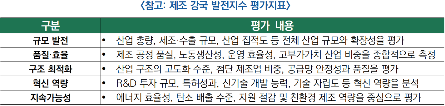 ○ 제조 강국 발전지수(2015부터~)는 △규모 발전 △품질 효율 △구조 최적화 △혁신 역량 △지속 가능성 등 5개 지표를 기준으로 세계 9개 주요국을 대상으로 제조 강국 발전지수를 산출함