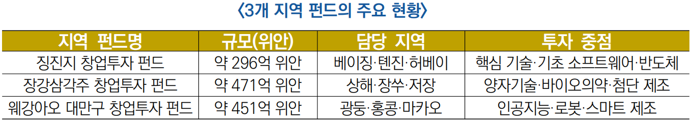 - (지역 펀드) 현재는 △징진지 창업 투자 펀드(약 296억위안) △ 장강삼각주 창업 투자 펀드(약 471억위안) △웨강아오 대만구 창업 투자 펀드(약 451억위안) 등 3개의 지역 펀드를 설립