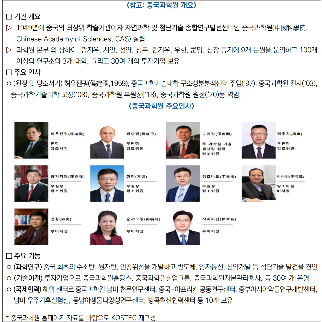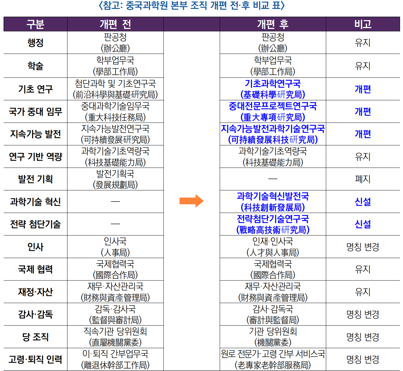 ○ (5개 부서 신설·개편) 중국과학원은 ▲과학기술혁신발전국, ▲기초과학연구국, ▲전략첨단기술연구국, ▲중대전문프로젝트연구국, ▲지속가능발전과학기술연구국 등 5개 부서를 신설·개편