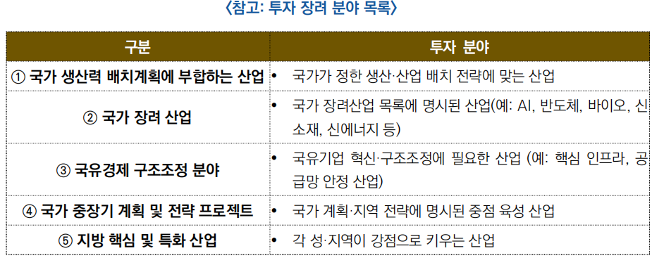 ○ ‘업무방법’은 정부투자펀드의 투자 방향을 사전에 설정하는 규범으로, ▲투자 장려 분야와 ▲투자 제한 분야를 명확히 제시해 정책 목표에 부합하는 투자를 유도하는 역할 수행