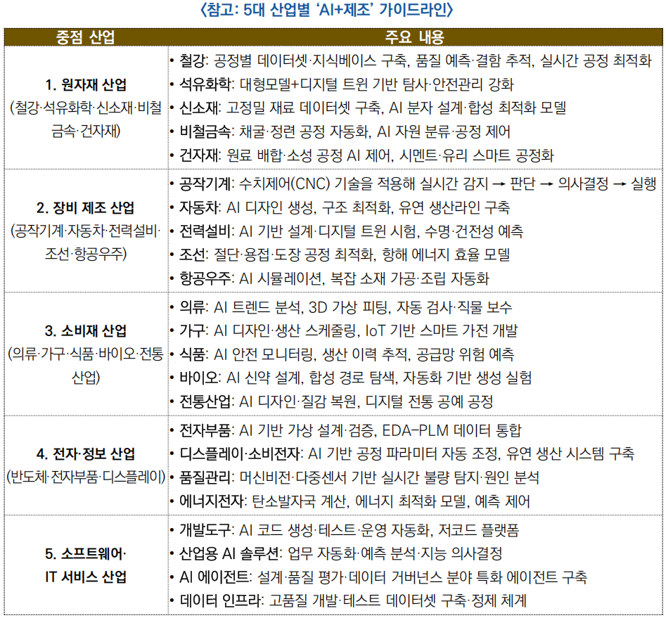 ![]() ○ 특히 이번 정책은 원자재·장비제조·소비재·전자정보·소프트웨어와 IT 서비스 등 5대 핵심 산업을 중심으로 AI 기술을 전면 도입해 제조 경쟁력을 높이기 위한 구체적 가이드라인을 제시