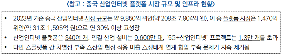 ![]() ○ (배경) 중국은 산업인터넷 인프라와 플랫폼 수는 빠르게 확대됐으나, 플랫폼의 품질, 산업 융합의 깊이, 실제 현장 활용 측면에서 한계가 지속적으로 제기됨