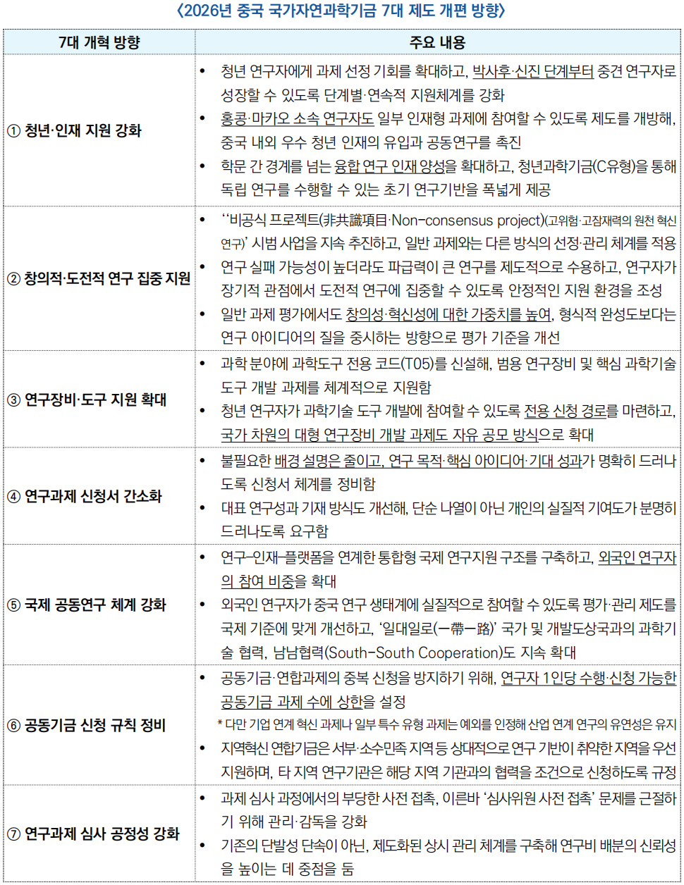 □ 중국 국가자연과학기금위원회(NSFC)*는 2026년부터 국가자연과학기금을 청년 중심·원천연구 강화·신청서 간소화 등 7대 방향으로 지원 구조 개편(26.01.19)