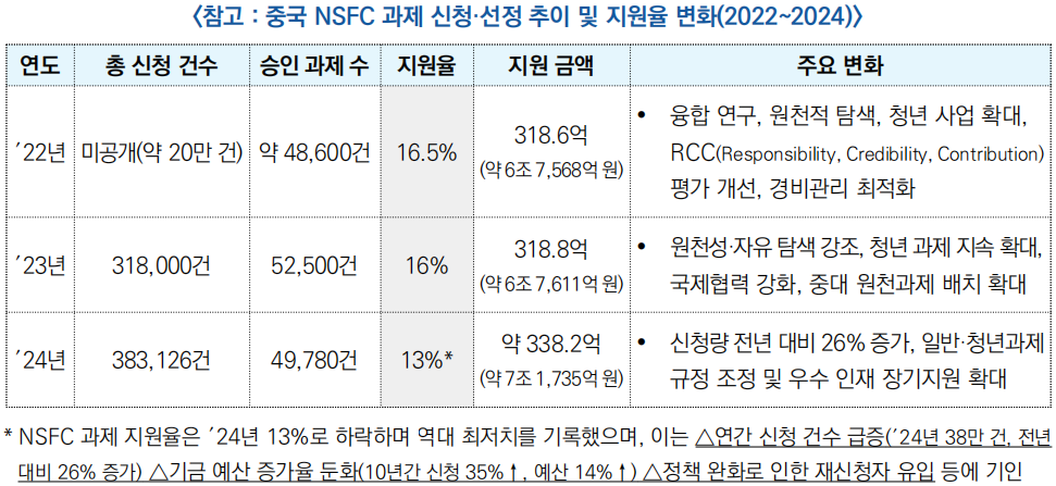 - 이에 NSFC는 정책 기조를 ‘양적 확대’에서 ‘질적 고도화’로 전환하고, 원천 혁신성과 청년 연구자 육성, 국제 공동연구 강화를 핵심 방향으로 설정