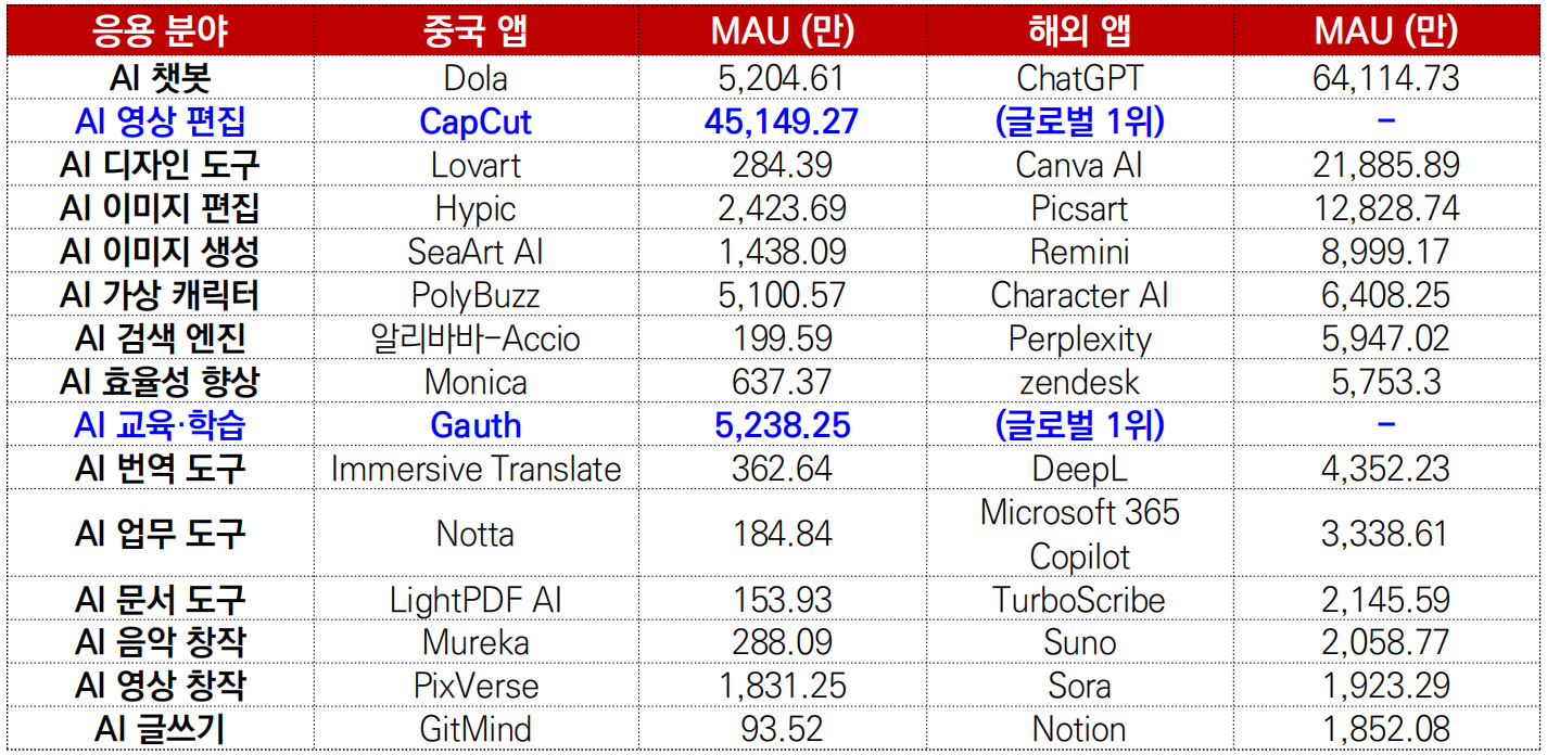 - 특히 바이트댄스(ByteDance) 산하 CapCut과 Gauth는 각각 AI 영상 편집과 AI 교육·학습 분야에서 글로벌 월간 활성 사용자(MAU) 1위 애플리케이션으로 자리잡았음