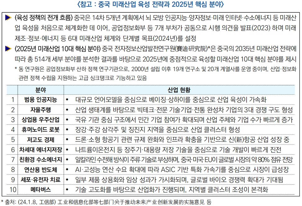 ![]() ○ (시진핑 주석 주요 연설 내용) 미래산업 분야에서 ①전략적 기획 고도화 ②핵심기술 혁신 ③기업 주도 산업 육성 ④정책·제도 지원 강화 ⑤안전·거버넌스 및 국제 협력 심화를 전방위적으로 추진할 것을 지시
