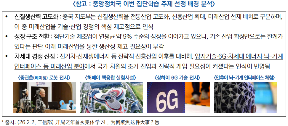 □ 시진핑 중국 국가주석은 2026년 중앙정치국 첫 집단학습*에서 ‘미래산업의 선제적 배치와 육성’을 주제로 연설을 발표하고, 미래산업을 신성장 동력과 현대화 산업체계 구축의 핵심 축으로 제시하며 기업 중심의 혁신 생태계와 정책 지원 체계 구축을 강조(26.01.31)