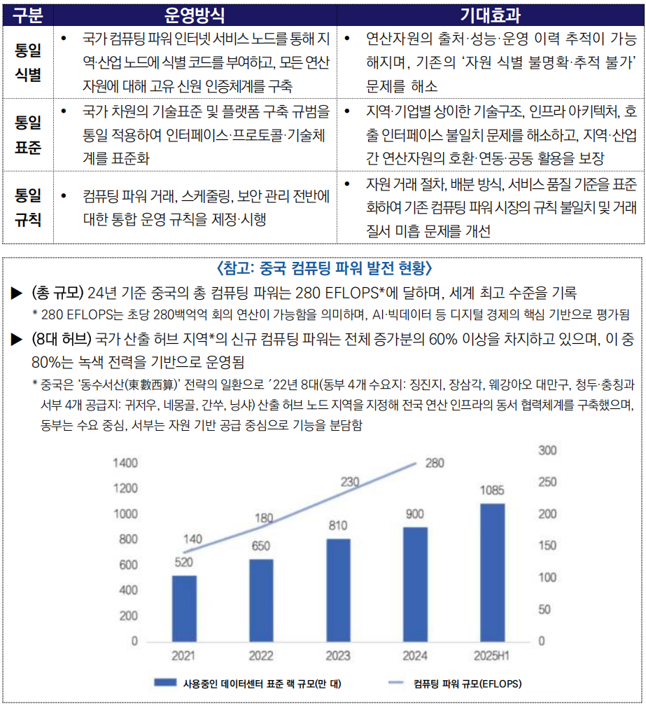 ○ (배경) 2025년 말 기준 중국의 총 컴퓨팅 파워 규모는 1초당 18 만억 회를 돌파하며 세계 2위를 기록했으나, 전체 활용률은 40%에도 미치지 못하는 비효율 구조가 지속됨