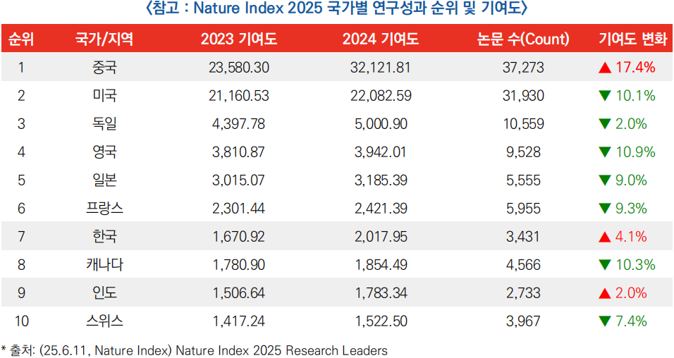 ![]() □ (글로벌 비교) ‘Nature Index Research Leaders 2025’에 따르면, 중국의 연구 성과 기여도(Share)는 32,121.81로 전년 대비 17.4% 증가하여 주요국 중 가장 높은 증가율을 기록