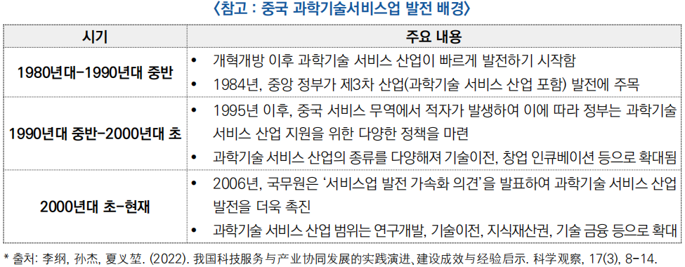 ** 과학기술서비스업은 현대 과학지식과 기술수단을 기반으로 연구개발, 기술이전, 기업 인큐베이팅, 시험·인증, 정보기술, 엔지니어링, 과기금융, 지식재산 등 혁신 활동을 지원하는 신흥 산업임