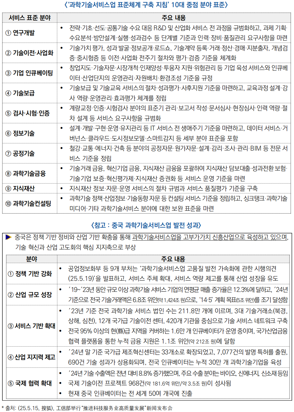 ○ 중국 국무원에서 발표한 ‘과학기술서비스업 발전 가속화 의견(2014.10.28)’은 과학기술서비스업의 표준 시스템을 구축하고 과학기술서비스업의 표준화된 발전을 촉진할 필요성을 강조