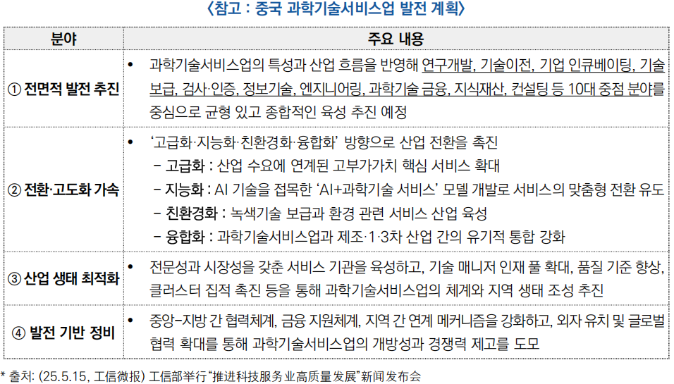 ![]() □ (향후 계획) 중국은 과학기술서비스업이 양적 성장과 질적 고도화를 동시에 추구하는 단계에 진입했다고 판단하고, 고부가가치 창출과 산업 전환 가속화를 위해 4대 중점 방향을 중심으로 발전 전략을 추진