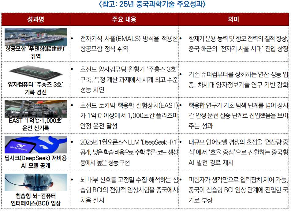 - 중국이 자체 개발한 항공모함 ‘푸젠함(福建舰)’이 정식 취역하였으며, 초전도 양자컴퓨터 원형기 ‘주충즈(祖冲之) 3호’ 구축에 성공