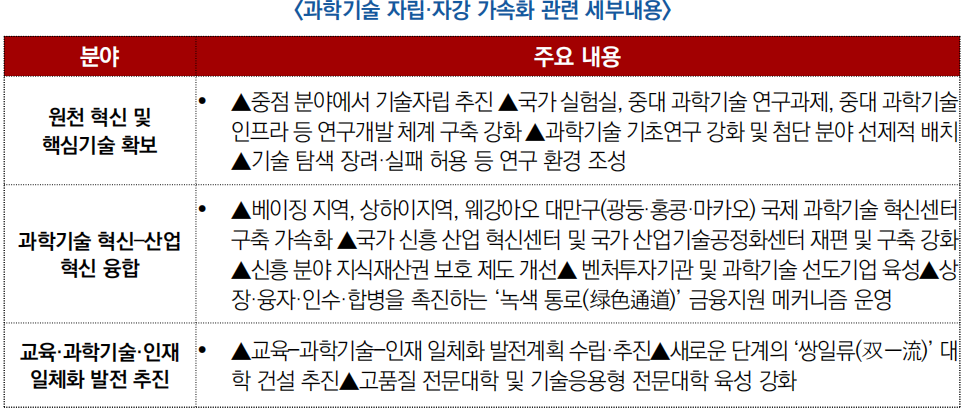(원천·핵심기술 확보) 중점 분야에서 기술자립을 강화하고, 국가 실험실·중대 과학기술 연구과제·중대 과학기술 인프라를 중심으로 연구개발 체계를 구축