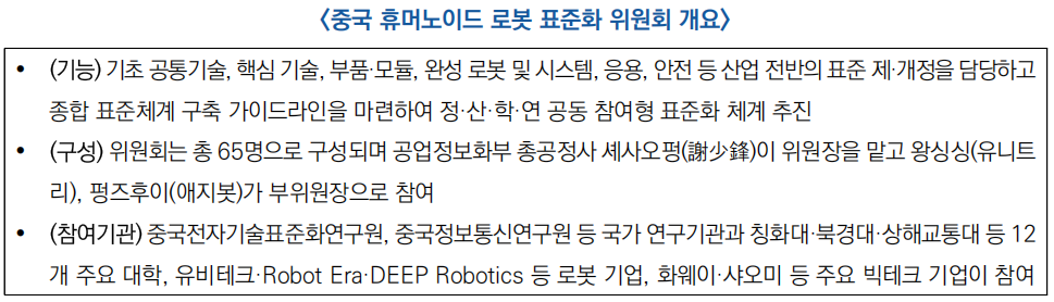 - 2025년 12월 공업정보화부는 휴머노이드 로봇 및 임바디드 인텔리전스 산업 표준화를 추진하기 위해 ‘휴머노이드 로봇 및 임바디드 인텔리전스 표준화 기술위원회’ 출범