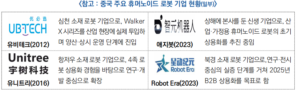 - (정책) ‘휴머노이드 로봇 혁신발전 의견(23.10/공업정보화부)’에서 2025년까지 핵심 기술 중심의 혁신체계를 구축하고, 2027년까지 산업 및 공급망 체계를 완성한다는 목표 제시