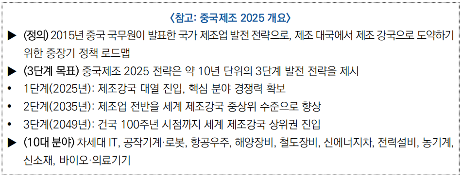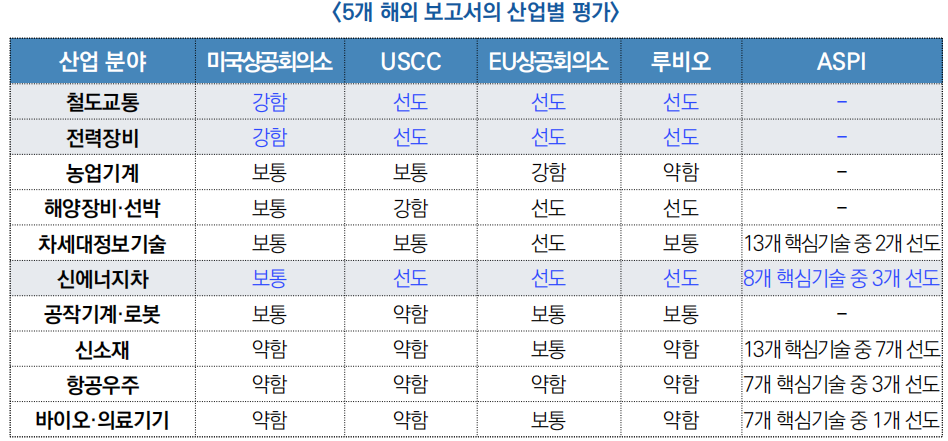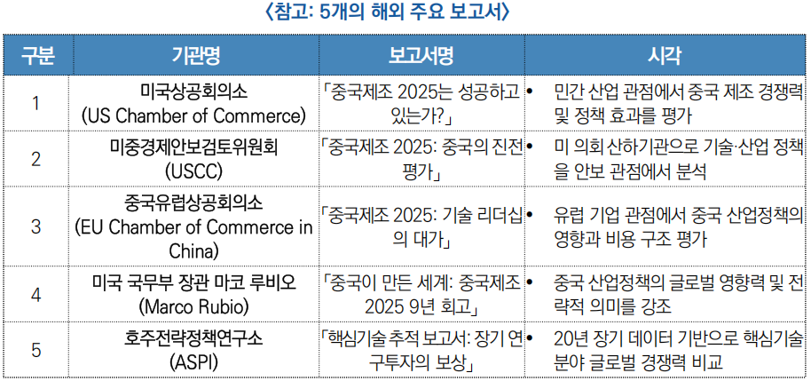 □ 최근 미국·유럽·호주 5개 해외 싱크탱크 보고서는 산업 경쟁력, 기술 수준, 시장 점유율 등 정량·정성 지표를 기준으로 「중국제조 2025」의 성과를 평가한 결과, 중국의 전력·신에너지차 등 일부 분야는 이미 선도 수준에 도달한 반면 반도체·신소재 등 핵심 분야는 여전히 격차가 있는 것으로 나타남