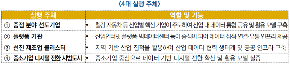 ○ (실행 주체) 이번 정책은 디지털 전환 기반이 비교적 성숙하고 산업 데이터 활용 잠재력이 높은 분야를 중심으로 4대 실행 주체를 선정하여 시범사업을 추진