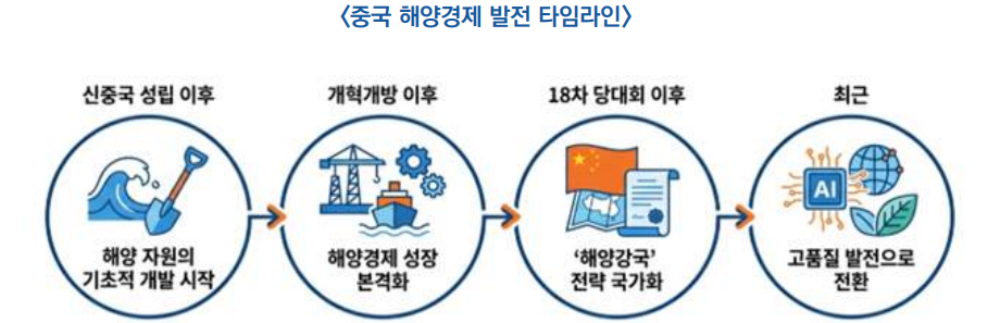 ○ (발전 단계) 중국 해양경제는 해양 자원의 개발·이용 중심으로 출발하여, 개혁개방 이후 산업화·규모 확대 단계로 진입했으며, 최근에는 국가 전략 차원에서 고도화·체계화되는 단계로 발전