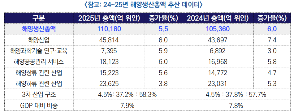 - (산업별) 25년 기준 해양경제는 1차산업 4,923억 위안(4.5%), 2차산업 4조 1,017억 위안(37.2%), 3차산업 6조 4,240억 위안(58.3%)으로 구성됨