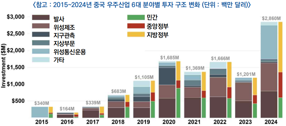 ○ (투자 구조) 중국 우주산업은 2014년 민간 개방 이후 발사체·위성제조 등 주요 분야 전반으로 투자가 확대됐으며, 최근에는 지방정부 중심으로 투자 구조가 재편되는 흐름을 보임