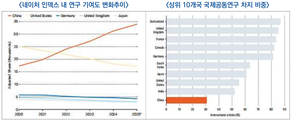 ○ (최신 순위) 네이처 인덱스 데이터(2024.9~2025.8)에 따르면 중국은 선도 격차를 계속 확대하고 있으며, 향후 2년 내 연구 기여도(Share)가 미국의 2배 수준에 이를 전망