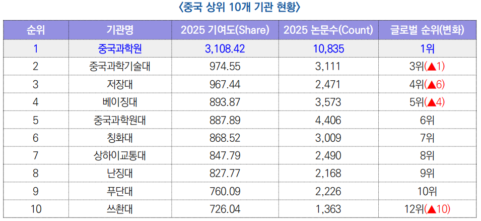 - 그중 중국과학원은 계속 글로벌 1위를 유지했고, 중국과학기술대(3위)·저장대(4위)·베이징대(5위)·쓰촨대(12위)의 글로벌 순위 상승이 두드러짐