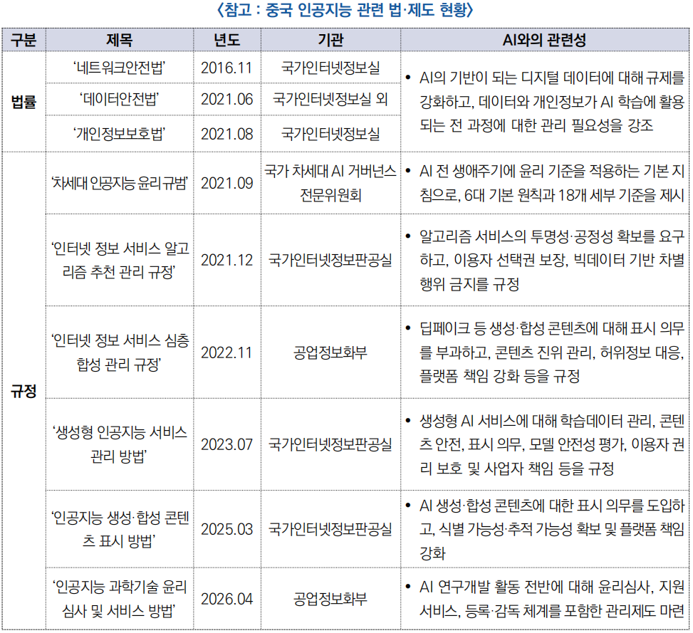 ![]() □ 최근 중국 공업정보화부 등 10개 부처는 ‘인공지능 과학기술 윤리 심사 및 서비스 방법’을 발표하고, AI 연구개발 전 과정에 대한 윤리 관리체계 구축을 추진 (26.04.06)